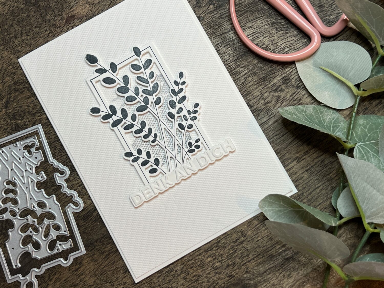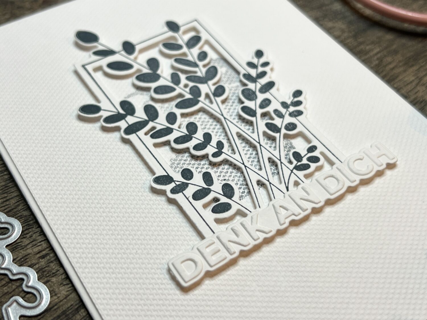 Das Motiv ist einfach gestempelt schon ein Highlight. Ihr habt aber auch die Wahl ob Ihr es nur außen ausstanzen möchtet, oder aber auch die Zwischenräume ausstanzen wollt. Letzteres habe ich hier angewendet und das Motiv mit Abstandsklebern etwas erhaben auf dem neuen Designerpapier „Ein Hauch von Textur“ angebracht. So hebt sich das Motiv schön ab und das Designerpapier kommt auch schön zur Geltung. Ich denke, man kann die Textur auf den Bildern gut erkennen.
