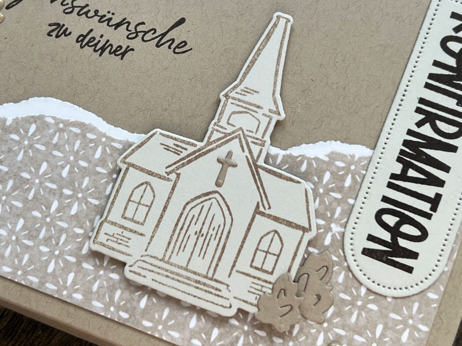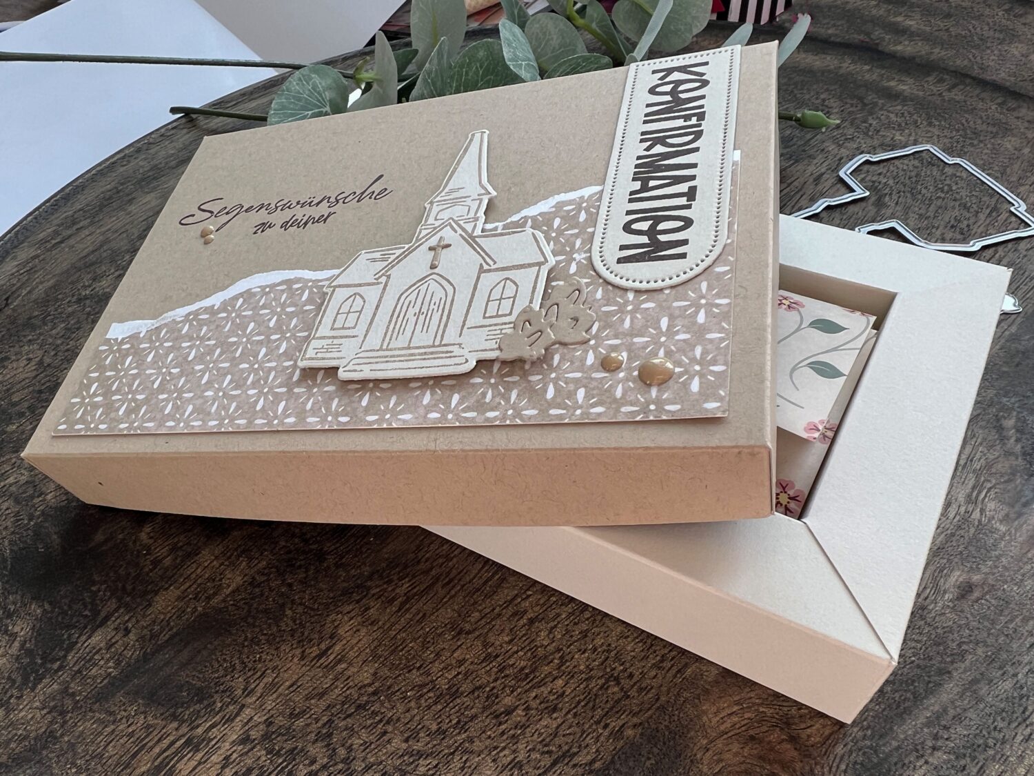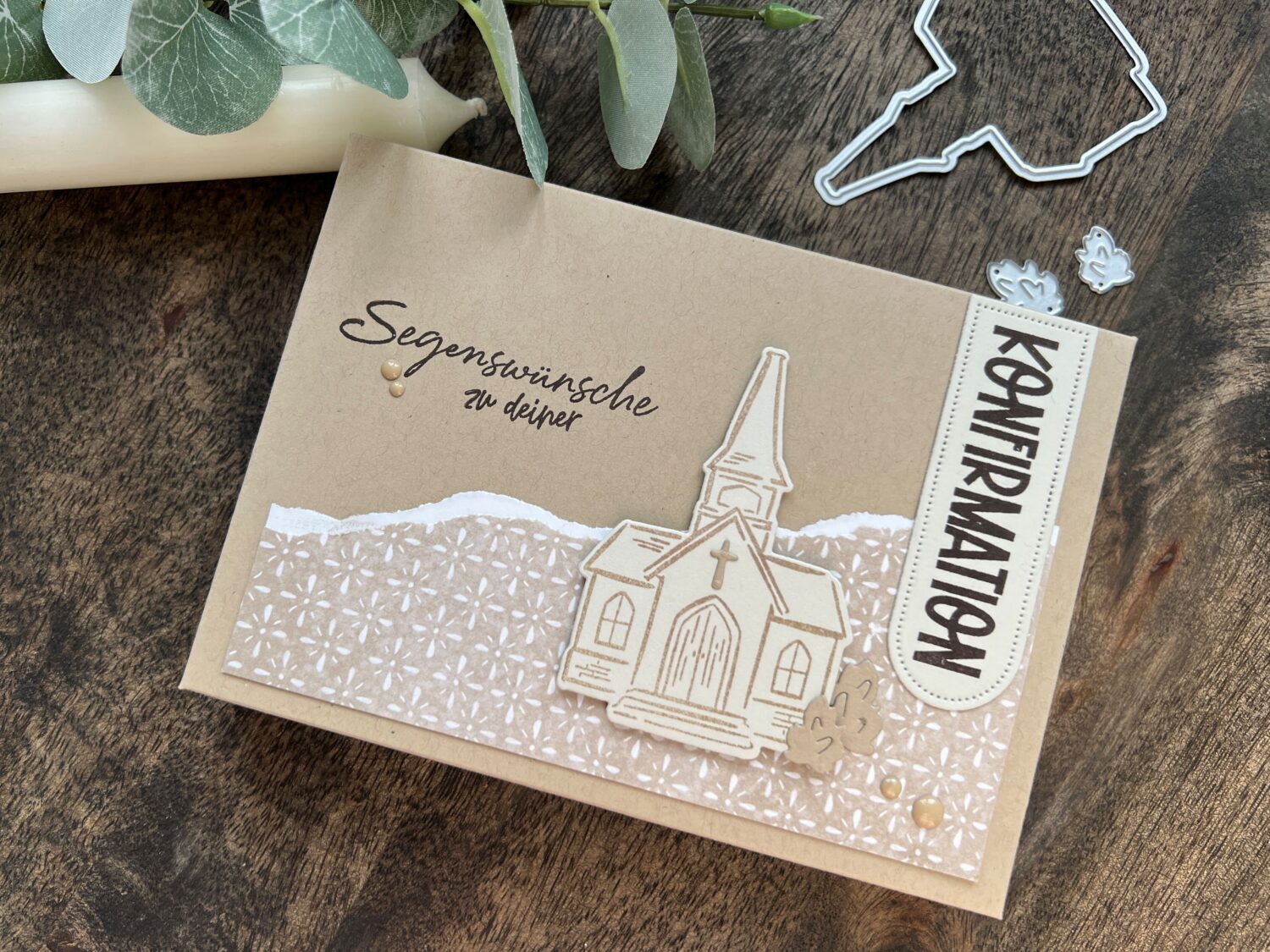 Beginnen möchte ich mit den Stempeln und Stanzformen „Segensgrüße“. Ein tolles Produktpaket aus dem neuen Minikatalog für die kommenden Hochzeiten, Kommunionen und Konfirmationen. Ich habe es hier für eine Schachtel zur Konfirmation genutzt, in der sich ein paar Kerzen zusammen mit einem kleinen Kuvert für Bargeschenke befinden. Ergänzt wurde das Projekt mit einem Stempel aus dem Set „Gründe zum Feiern“, welches wunderbar mit den Segensgrüßen harmoniert und die Einsatzmöglichkeiten erweitert.